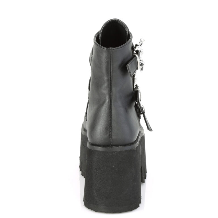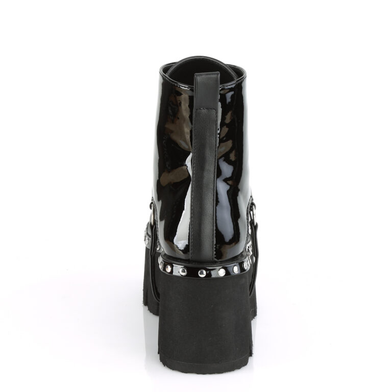 Tacco grosso da 9 cm. Stivaletto con plateau di 5,7cm intagliato e 3 cinturini con fibbia a pipistrello con borchie