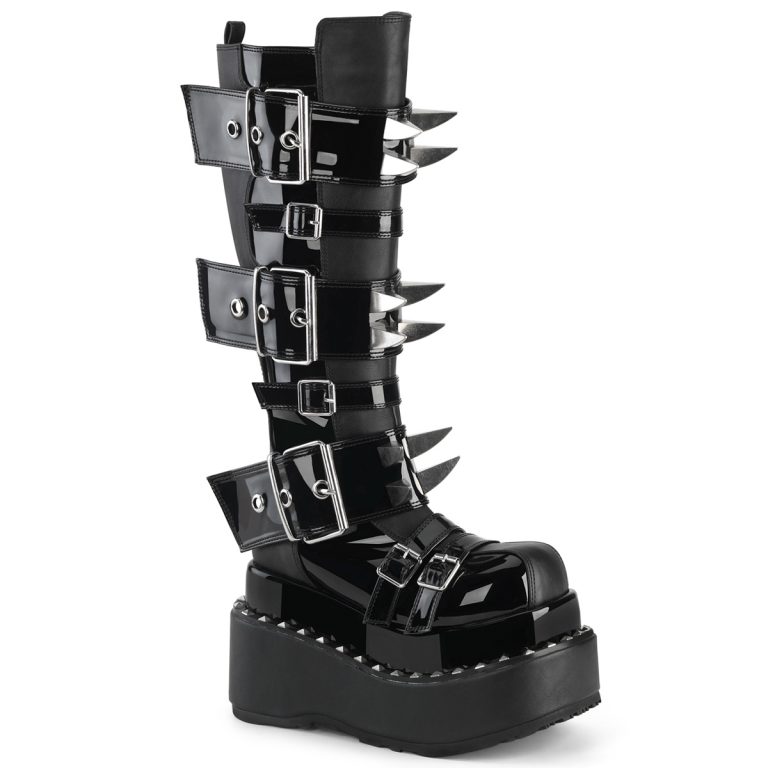 Tacco grosso da 9 cm, Platform da 5,7 cm con cut-out. Stivali al polpaccio con lacci e occhielli a cuore con triplo gancio e cinturini ad anello con dettagli di borchie a cuore e cinturino inferiore regolabile foderato in pelliccia con medaglione a cuore e D -Dettagli anello, chiusura con zip laterale in metallo.