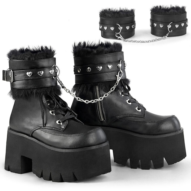 Tacco grosso da 9 cm. Stivaletto con lacci e occhielli a cuore con plateau intagliato, polsini regolabili rimovibili foderati in pelliccia con borchie a forma di cuore, anello a D e catena con ganci a scatto girevoli, metallo Chiusura con zip laterale.
