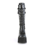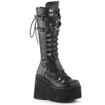 Stivali alti al ginocchio stringati con anello a D e piattaforma dotati di scudo regolabile con O-ring oversize, chiusura con zip in metallo sul retro a tutta lunghezza. Altezza tacco 11.5 cm